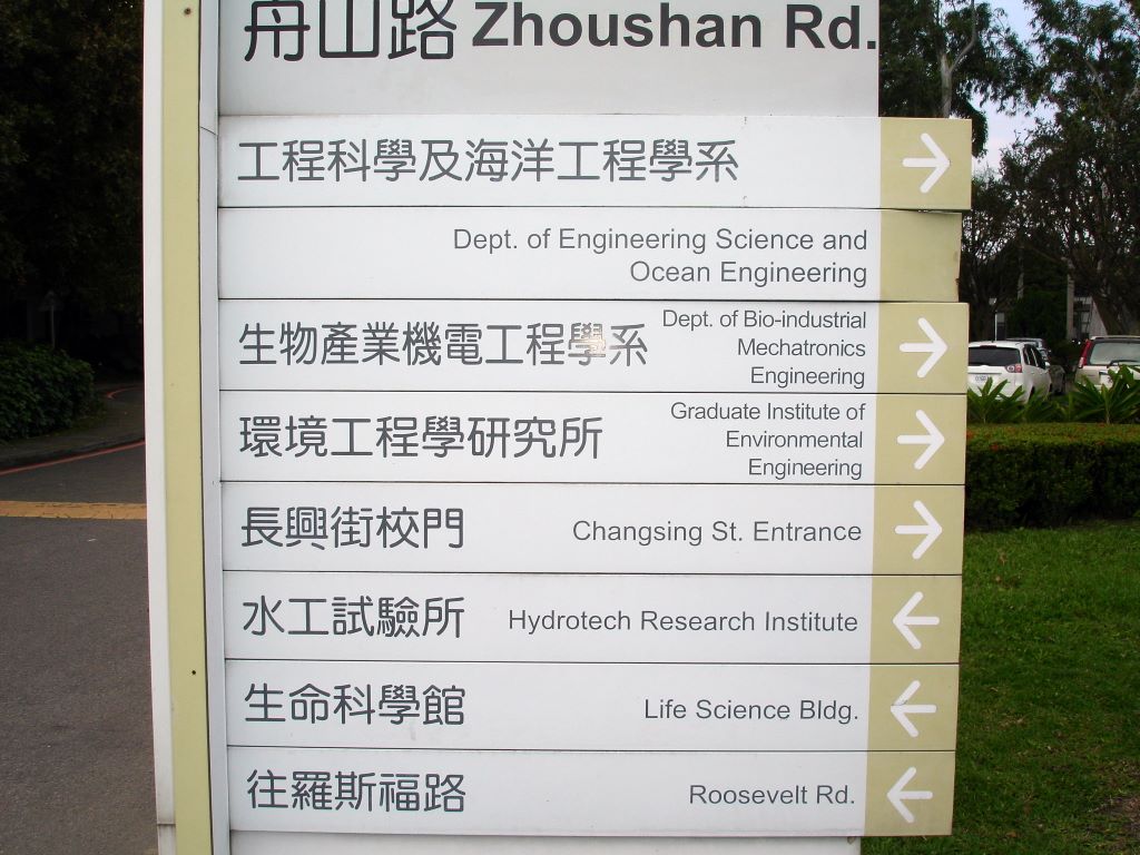 A road-sign on campus. Notice how big the English lettering is... and how all of the departments are related to bio-/environmental science/engineering.