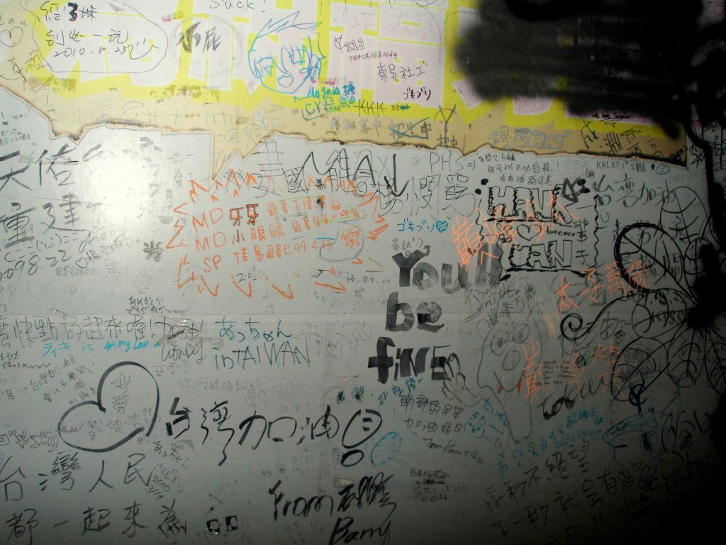 More graffiti (building art?) in 士林. I love how there is Chinese, English, and Japanese co-existing on this wall.