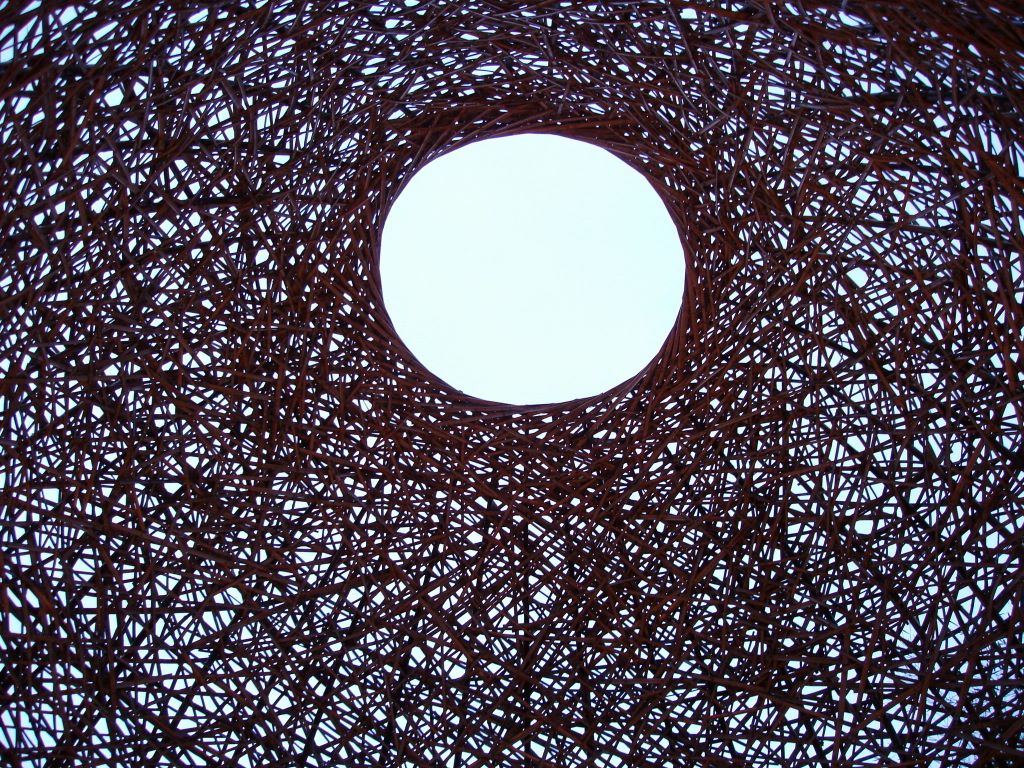 Looking upwards in the center of a beautiful wood mesh hut.