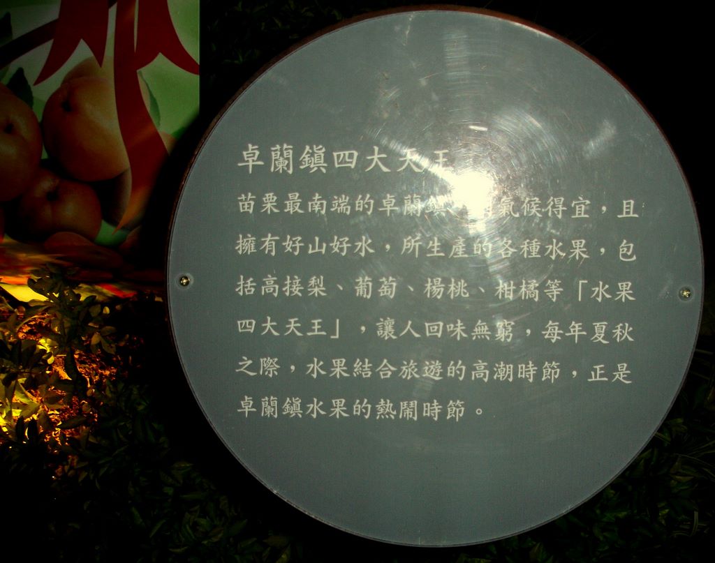 This plaque talks a little bit about 卓蘭, my father's hometown - a little story on 水果四大天王 (shuǐ-guǒ-sì-dà-tiān-wáng) - four heavenly kings of fruit is how I understand it... how scenic it is, how various fruits are grown there, and how busy it gets during the time between summer and fall where people come for the fruits.