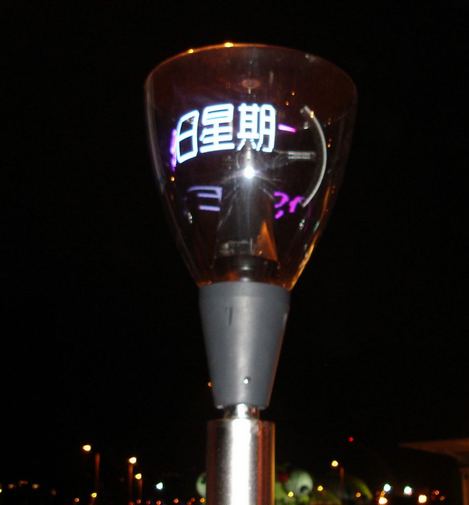 A combination street light/information ticker. The characters actually scrolled in a circle around the enclosure, and the light provided illumination. This photo shows the sign displaying information about what's going on at the Expo on Sunday.