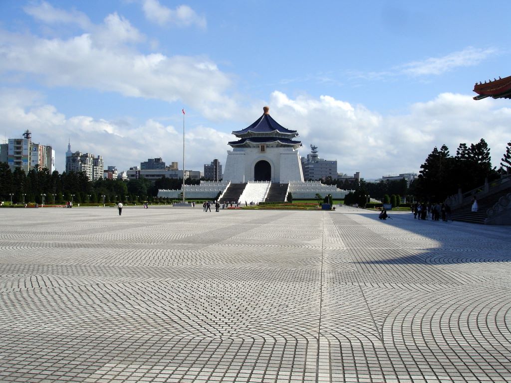 Taiwan國立中正紀念堂 (guó-lì-Zhōng-zhèng-jì-niàn-táng) - Chiang Kai-Shek Memorial Hall - in the distance. The courtyard is actually a huge space; 國家戲劇院 (guó-jiā-xì-jù-yuàn) - National Theater - and 國家音樂廳 (guó-jiā-yīn-yuè-tīng) - National Concert Hall - are both in the same general area. You can actually see 國家戲劇院 on the right side of this photo.
