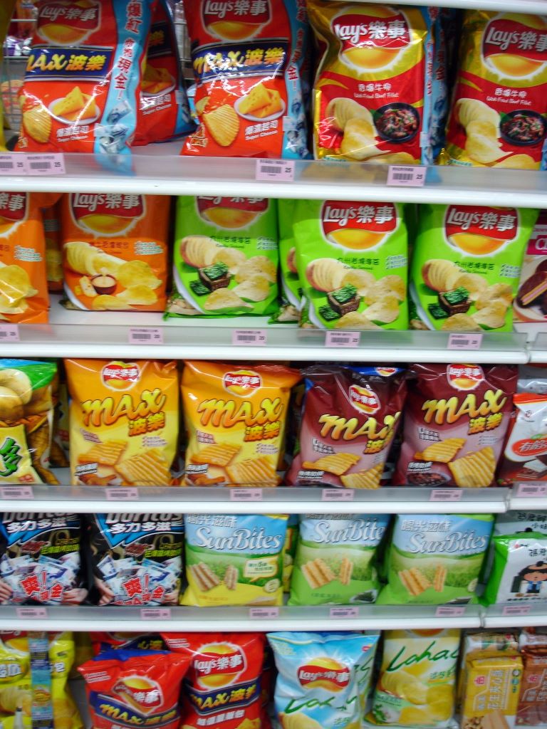 The curious flavors of potato chips in a 7-1. "Beef-flavored" and "seaweed" Lays - mmmmmm.