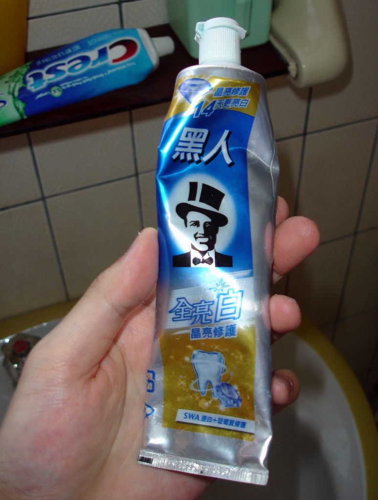 Here's some interesting toothpaste. The characters 黑人 translate to "black person" - not really sure what to make of it. Do black people make good toothpaste?